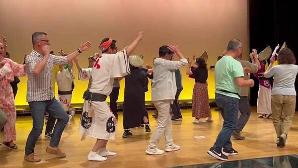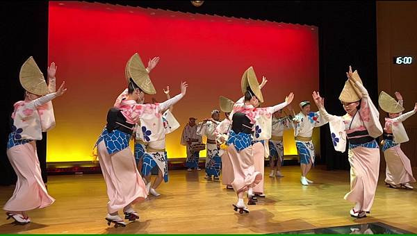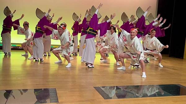 ↓白天在阿波舞會館欣賞了阿波舞後,主持人會邀請觀眾上台效仿示例嘗試跳舞。首先站在原地試著取得節奏,然後練習如何移動雙腳,接著實踐如何使用雙手。阿波舞講究「舉起手來,邁起步來跳舞」,因此手和腳的動作配合很重要。男性動作要豪邁,女性動作要柔美。手腳移動的同時邊喊著「yatosa」,意思是「好久不見,最近可好?」。