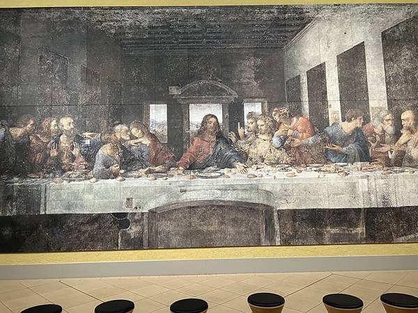 ↓這是『最後的晚餐』,是一幅廣為人知的大型壁畫,文藝復興時期由李奧納多·達·文西繪於米蘭天主教會院食堂。畫面利用透視原理,使觀眾感覺房間隨畫面作了自然延伸。耶穌攤開雙手鎮定自若,和周圍緊張的十二使徒形成鮮明的對比。耶穌背後的門外是祥和的外景,明亮的天空在他頭上彷彿一道光環。他的雙眼注視畫外,好像看穿了世態炎涼