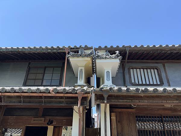 ↓「卯建」(うだつ,漢字寫「卯建」,中文「短柱」之意,讀作「udatsu」)是位於街道上店面建築設置於屋頂兩側的防火牆,但由於需要花費額外的建築費用,在關西地區逐漸發展為展現財力的裝飾物;過去脇町因藍商而繁榮,這些「卯建」即成為當時繁榮的象徵,現存的卯建大約有50個,是現在日本保留最完整的地方。日本有句古老成語: 建不成卯建(うだつが上がらない)意思就是指手頭緊、捉襟見拙。