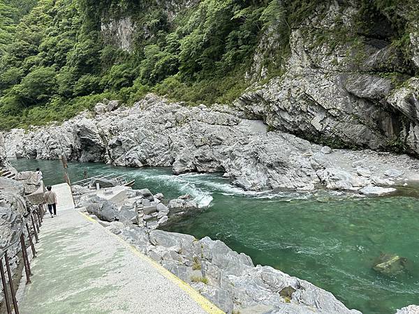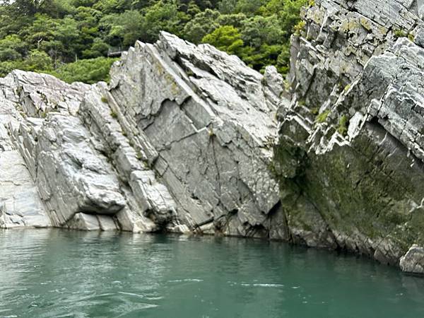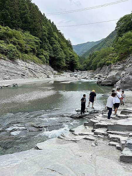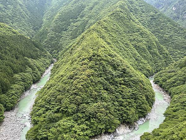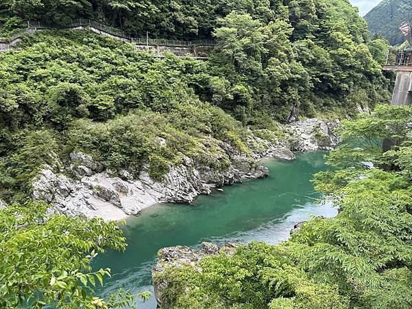 ↓吉野川蜿蜒而行,輕撫著群山腳下的岩壁。峽谷深邃如墨,溪水清澈見底,碧波映著天光雲影,彷彿天地之間的一面鏡。