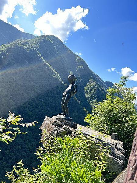 號稱日本三大秘境之一的祖谷,地形呈現連續V型。當你一步步踏上祖谷那條蜿蜒山路,空氣逐漸由清新轉為銳利,彷彿能劃開呼吸的輪廓。盤旋上山後,眼前忽然開闊,綠意沉沉的峽谷如萬丈深淵展開,那一刻,你不自覺地屏住了氣息。在七曲這個溪谷水流最險惡、地形最驚險的地方,有一塊突出於溪谷路基之外、臨空約200公尺的岩石。岩石懸崖邊立著這麼一尊膽大包天的小銅像——祖谷小便小僧像。他立在一塊懸崖峭壁的石台上,背對高山密林,面朝深不見底的斷崖,兩腳直立,肆無忌憚地解放自我。彷彿他並不在意腳下就是垂直落下兩百公尺的深谷,只在意那瞬間的爽快。它是德島縣出身的雕塑家河崎良行於1968年時製作的,據說其創作靈感來自於常有當地孩童或旅人在此考驗膽量。從這裡望出去,整個祖谷峽谷如詩如畫,但也如虎如龍。翠綠的山巒像是護城巨獸,深谷則像張開的巨口,吞噬一切膽怯的靈魂。而這位小僧,像是與自然賭氣的孩子,用一股天真的無懼對抗世上最古老的力量。站在小便小僧旁邊,你可以聽見下方祖谷川的潺潺流水聲在峽谷間回盪,而風從崖邊呼嘯而過,像是在訴說過去旅人的驚嘆與膽怯。遊客若想要與小便小僧合影恐須冒生命危險。現在禁止遊客越過欄杆到岩石上,遊客務必注意個人自身安全。
